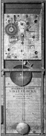 Fyler's main claim to horological fame is the design of a striking clock that would run for 8 days in a much shorter than usual case using two hammers driven by a common pinwheel, and a temperature-compensated (See Fig. 6.) pendulum (never patented) to correct for the likely tremendous indoor temperature swings before central heating became common. BULLETIN #294, Pg. 75, has a thorough discusssion of his first patent. | |
