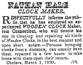 I find it somewhat odd that Hale should label himself "CLOCK MAKER" in this advertisement since he evidently hadn't made more than one or two clocks since some time before 180711. Lane Kendall Fyler quotes a Fyler genealogical correspondent: |